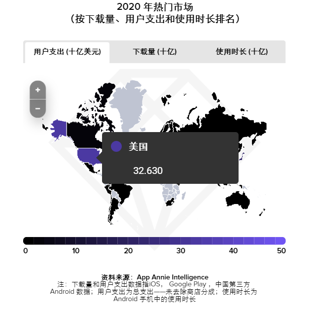 整体上,2020 年,全球移动 App 的下载量增长并没有我们想象得那么多,同比增长 7%,达到 2180 亿次,但是在用户支出上,算是回报丰厚的一年,同比增长 20%,达到1430 亿美元,数据创下新高。