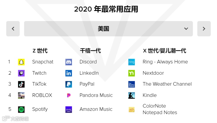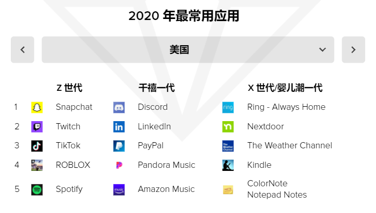 上图是 2020 年最常用应用,评选的标准是平均 MAU 数。这里面一个 Facebook、谷歌系的 App 还是很奇怪的,也许是三代人 MAU 总和很高,但在每一代人里面最常用的 App 又没有很靠前。