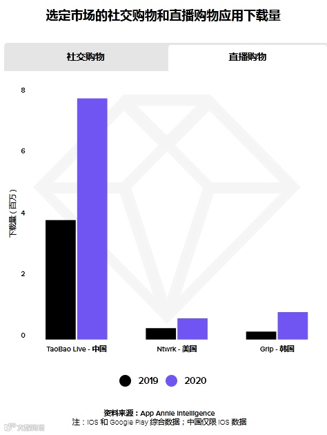 中国是直播购物行业最早的推动者,成长速度超过世界其他地区,2020 年中国 iOS 端用户“淘宝直播”下载量较 2019 年增长了 100%。直播带货在其它国家处于刚刚起步阶段(详情参阅《2021 年了,在海外能做直播带货吗?》),面临的最大挑战是消费者信任度不高,不过部分市场还是展现出强大的增长潜力。例如,韩国的 Grip 以及美国的 NTWRK 等直播购物应用下载量分别增长 245% 和 85%。
