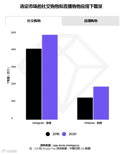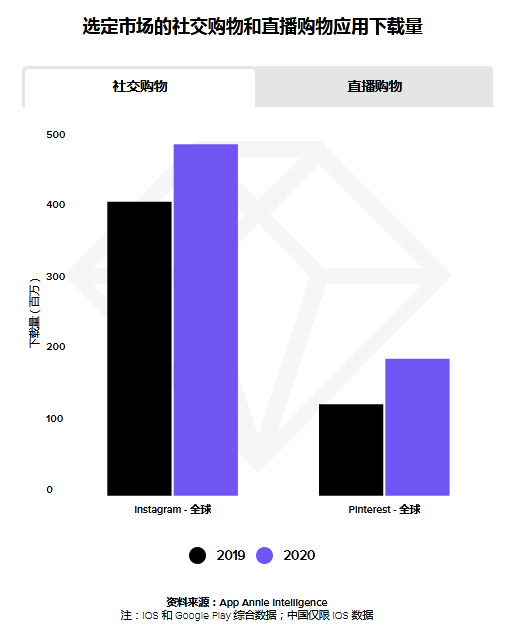 最后,除了一般形式的购物 APP,社交和直播购物也成为消费者新的购物形式,App Annie 数据显示,2020 年,Pinterest 和 Instagram 的全球下载量分别实现同比增长 50% 和 20%。到 2024 年,社交购物和直播购物应用将在全球带来价值 2 万亿美元的市场。