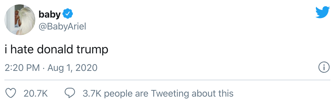 “我憎恨唐纳德·特朗普。” 19岁的艾莉儿在TikTok拥有3450万粉丝,是平台最受欢迎的红人之一。她得知消息后,在推特上发布了这样一句话。