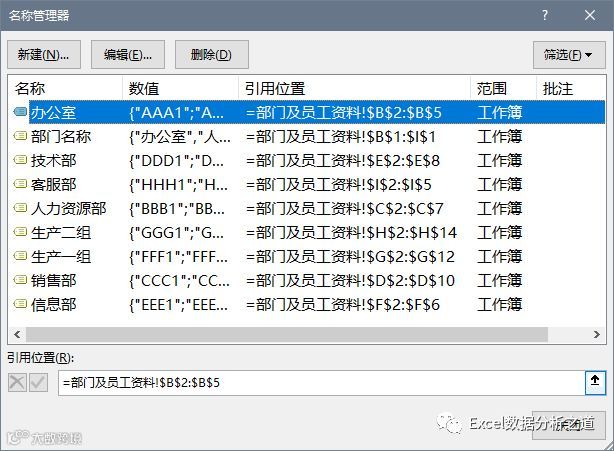 单击“公式”→“定义的名称”→“名称管理器”命令,打开“名称管理器”对话框,可以看到我们定义了很多名称,其中各个部门员工姓名区域的名称就是第1行的部门名称。
