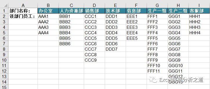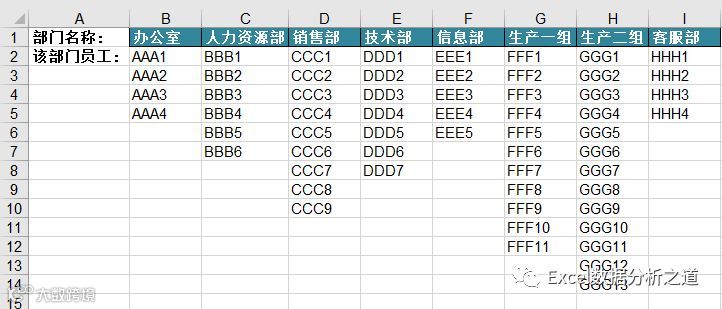 步骤1:首先设计部门名称及其下属员工姓名列表,如下图所示。其中,第一行是部门名称,每个部门名称下面保存该部门的员工姓名。