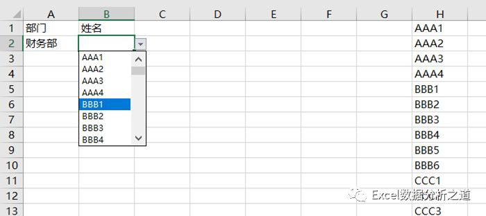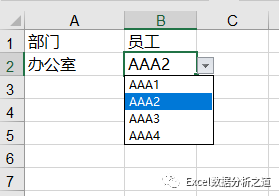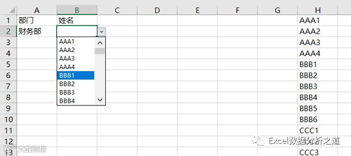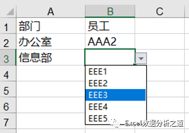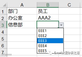 这样,在A列的某个单元格选择输入部门名称,那么就在B列的该行单元格内只能选择输入该部门所属的员工姓名,如下图。