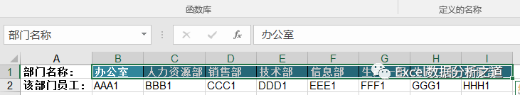 步骤4:再选择单元格区域B1:I1,鼠标单击名称框,输入名称“部门名称”,然后按Enter键,将这个区域定义名称“部门名称”,如下图。
