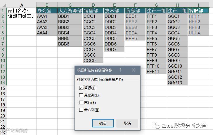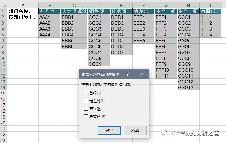 步骤2:选择B列至I列含第一行部门名称及该部门下员工姓名在内的区域,单击“公式”→“定义的名称”→“根据所选内容创建”命令,如下图。