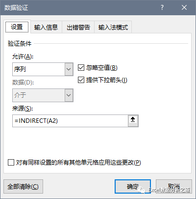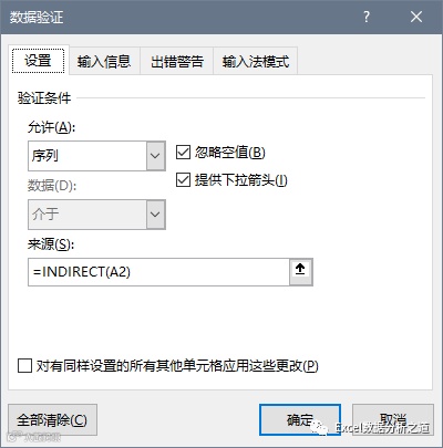 在“来源”栏中输入公式“=INDIRECT(A2)”。
