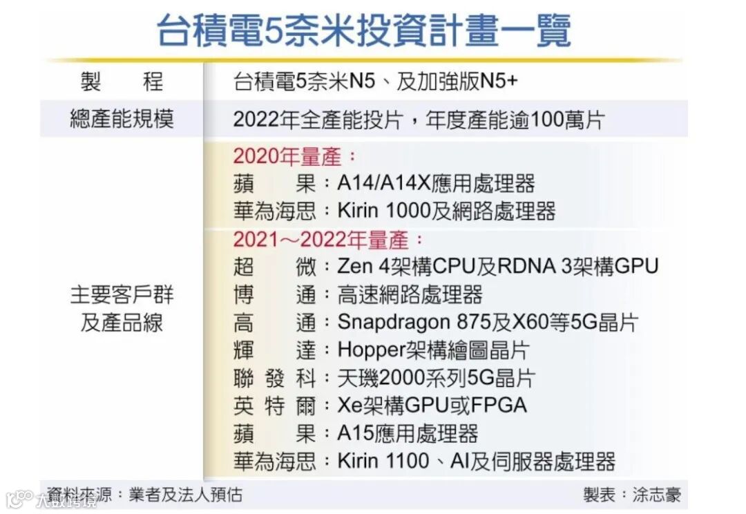近日,有博主分享了一张台积电5nm投资计划表,表示主要客户群和产品:苹果A14、麒麟1000、高通骁龙875及X60基带等均涵盖其中,其中苹果A14和麒麟1000将于2020年今年内量产,而骁龙875将于2021年量产。