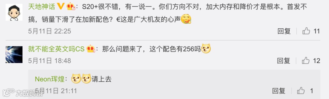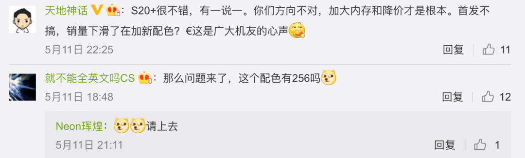 可以说红色也是不少用户喜欢的颜色之一,但一如既往这次也收到了很多吐槽,更多三星用户或网友更希望三星能推出256GB版本,而不是一味的增加配色。说到配色,最近S20 Ultra新增意象白配色、S20+新增馥郁红配色,或许下个月三星还会给小号S20也来个白色或红色?🤔