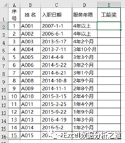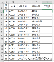 且不论公式怎么设置,单单看这个表格,能用公式计算工龄奖吗?D列的服务年限居然是手工输入的文字,而且还是辛辛苦苦掰着手指头算好后输入的,这样的文字如何判断大小?为什么不用函数算出一个真正的能够判断大小的服务年限数字出来?这样的表格,如何能达到高效计算和分析?