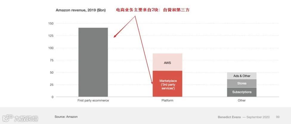 产品销售,主要是自营电商;服务销售就复杂一些,AWS 云服务+第三方商家服务(抽成、物流等等)+广告、订阅等等。