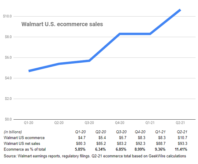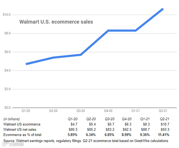 2020 年 6 月,沃尔玛宣布与 Shopify 达成合作,Shopify 的美国商家能够在沃尔玛的平台上出售产品。6 月 15 日,TechCrunch 报道,沃尔玛的 Marketplace(第三方)卖家突破了 5 万,是 2019 年 6 月的两倍。沃尔玛 2020 年 Q2 财报显示,电商销售额飙升了 97%。