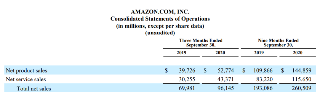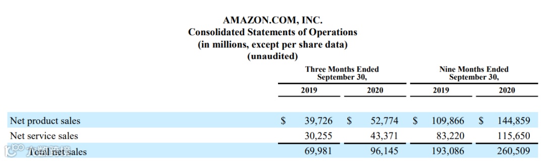 亚马逊的销售额按照形式来看的话,主要分 2 部分,产品销售和服务销售。