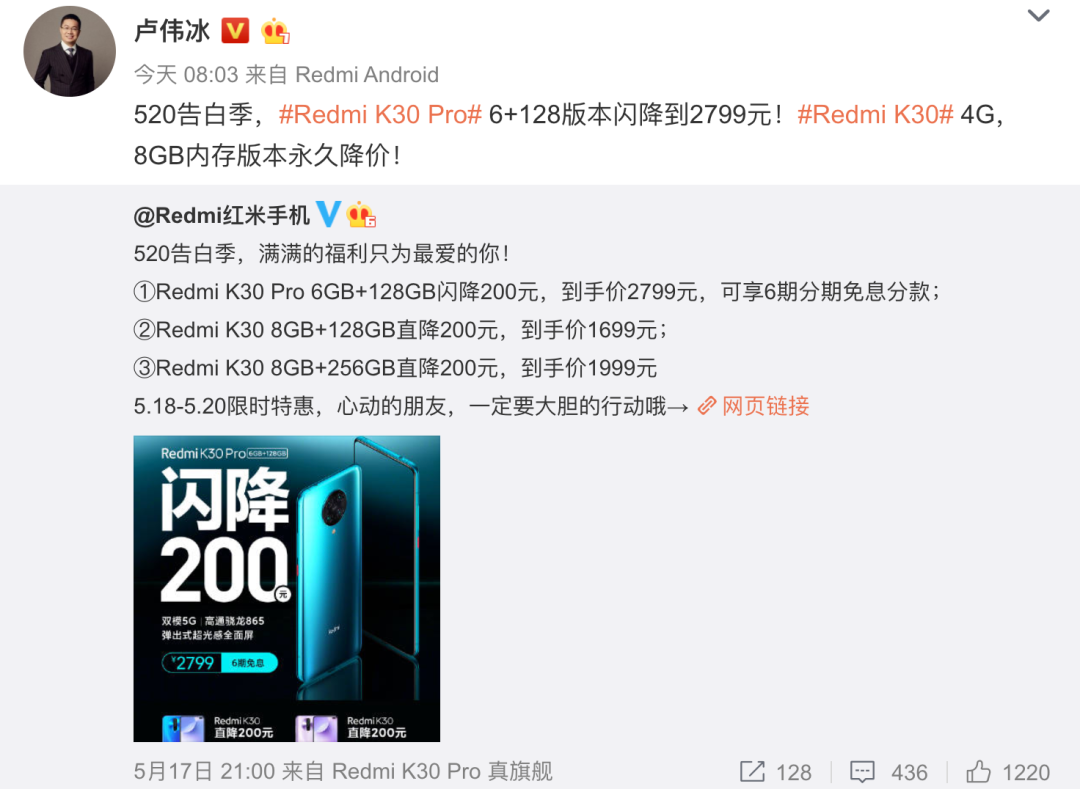昨天晚上,Redmi红米手机官方微博毫无预兆地宣布了一则促销信息:Redmi K30 8+128/256GB版永久直降200元(4G);Redmi K30 Pro 6+128GB版5.18-5.20三天内限时直降200元,到手价2799元。