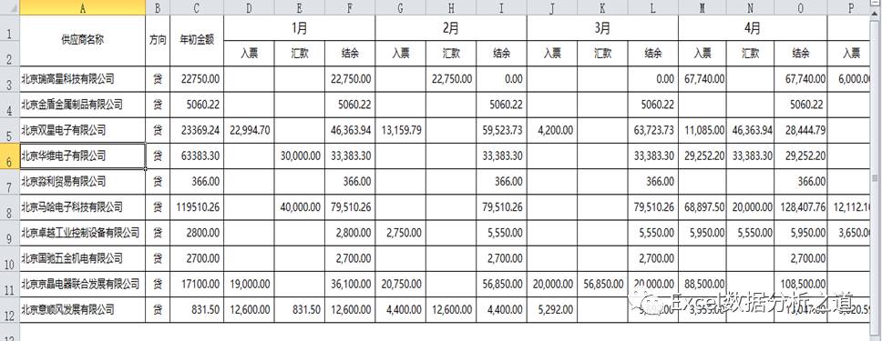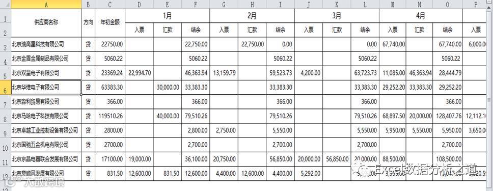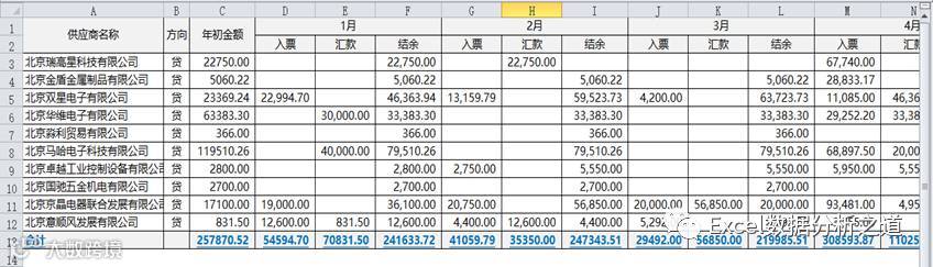 这是一个典型把Excel当成Word来使的例子。实际上,这个表格仅仅是一个每个供应商、每个月的汇总表报告,而不是原始应付数据的管理表单。在实际工作中,把表格设计成这样结构的不在少数。这样的表格主要问题是: