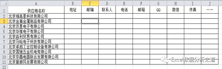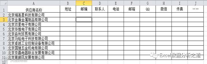 在这些数据信息中,供应商基本资料是相对固定不变的数据,包括供应商编码、供应商名称、地址、邮编、联系人、电话、邮箱、等等。这些信息单独建立一张工作表进行保存,单独管理,新增加的供应商按行依次往下保存,不再联系的供应商仍旧保存其数据(不能删除),这样,表格结构设计如下所示。