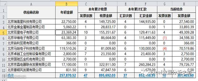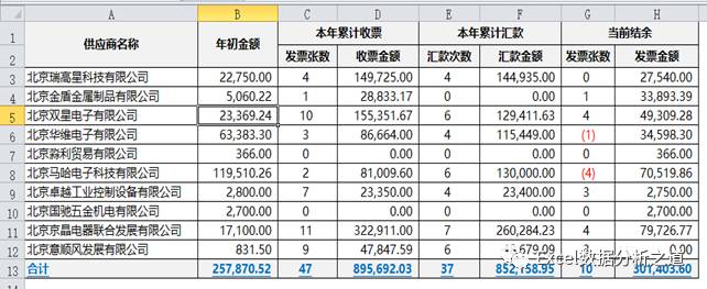 3、表格中存在着两个性质截然不同的数据信息:一是几个重要的、属于不同管理性质的基础数据流信息,比如供应商资料信息、年初余额信息、入票信息、汇款信息,二是根据基础数据计算出来的汇总数据信息,比如每月计算出的结余数据,但小蔡却把这些信息数据弄到了一个表格上,做了一个大而全的表格,不仅输入数据不方便,看各月数据不方便,计算汇总更不方便;