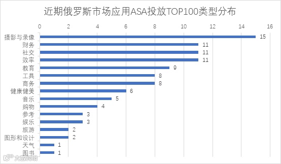 俄罗斯是目前新冠疫情比较严重的国家,并相伴有比较严格的管控措施。这直接导致了出行需求的减少,当然也催生了更多线上办公和学习、线上社交、财务管理、娱乐和健身需求。从本次统计到的榜单来看,摄影与录像类的App在ASA投放TOP100中占据15款,结合在TOP100中占据11款的社交类App,可以判断疫情管控让用户们更多寻求线上的展示自我与社交途径,因此,相应类型的产品也积极进行投放抢占红利期。