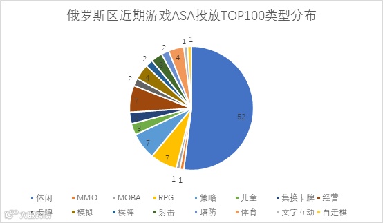 如上图,我们收集了俄罗斯市场开放ASA投放之后,近期在投放榜单上最靠前的TOP100游戏产品。从类型分布上来看,近一两年兴起的休闲和超休闲游戏热潮势头依旧强劲,在TOP100款游戏中,有半数以上(52)款产品都是休闲游戏,如果算上3款儿童游戏和3款棋牌游戏,那么休闲类产品就占据了TOP100总数的近60%;此外,被归为Mid-core领域的模拟类(4款)和经营类(7款)游戏,两个类型共有11款。传统类型的卡牌游戏有3款,RPG游戏有7款。偏重度硬核的类型中,MMO、自走棋和MOBA各有1款;细分领域的文字互动类游戏有1款。