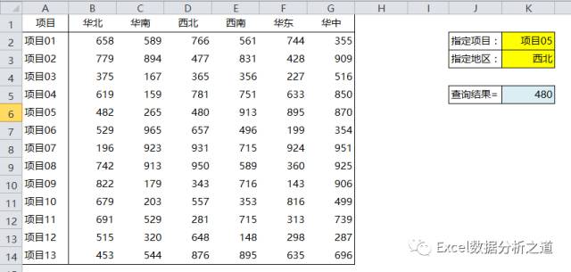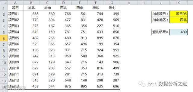 下图是一个最简单的二维表,现在要查找指定项目、指定地区的数据,你会做哪个公式?