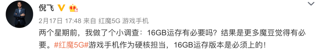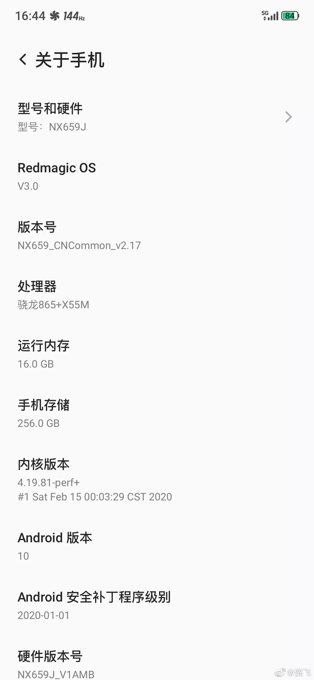 倪飞预热红魔5G游戏手机型号为NX658J,配备16GB运存+256GB储存规格,内置Android 10,搭载骁龙865+X55支持NSA和SA双模5G。
