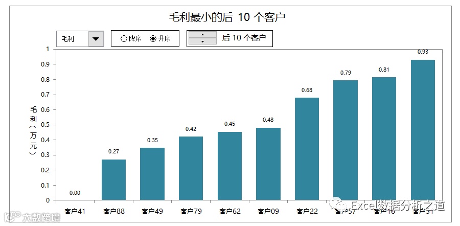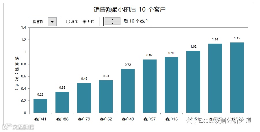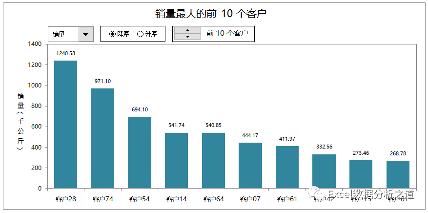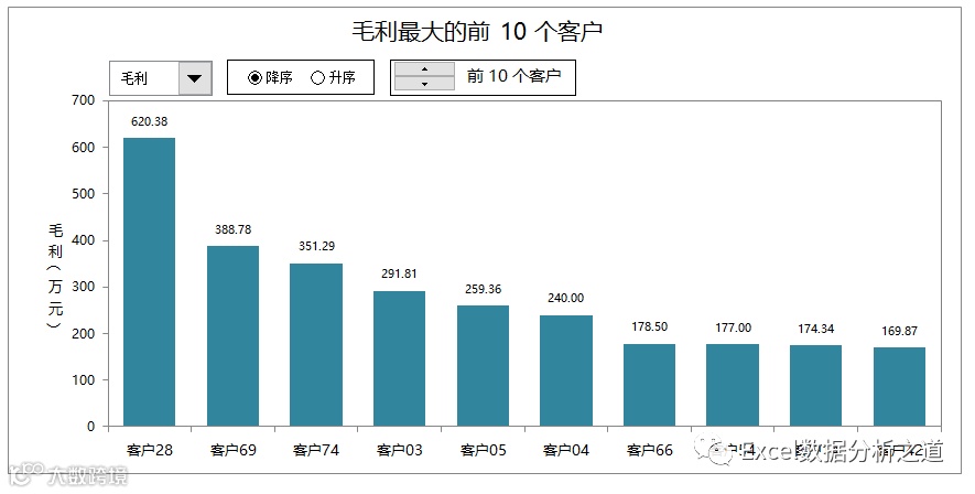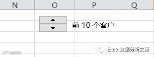 由于客户有上百个,在画图分析时,不可能把所以所有数据都画出来,而且我们也要分析前N大(前N小)客户,这样画图的数据区域是一个变动的区域,因此需要使用数值调节钮来控制查看客户的数目,并使用OFFSET函数定义动态名称