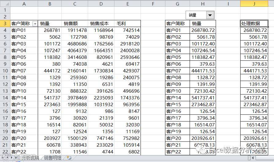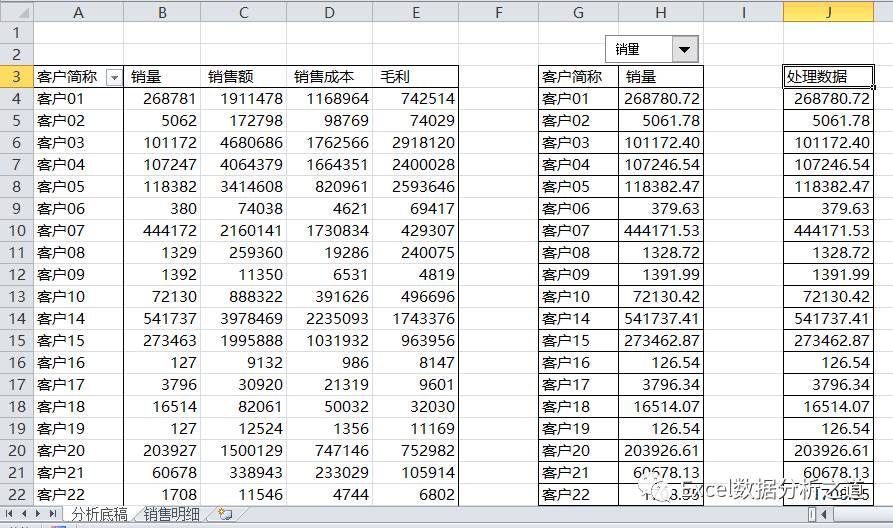 有了这列数据,就可以进行排序分析了。不过,考虑到实际中,会存在几个一摸一样的数据,这样在进行排序处理时,造成数据排序后客户名称的查找变得困难,故使用随机数来处理数据,如下图J列所示:
