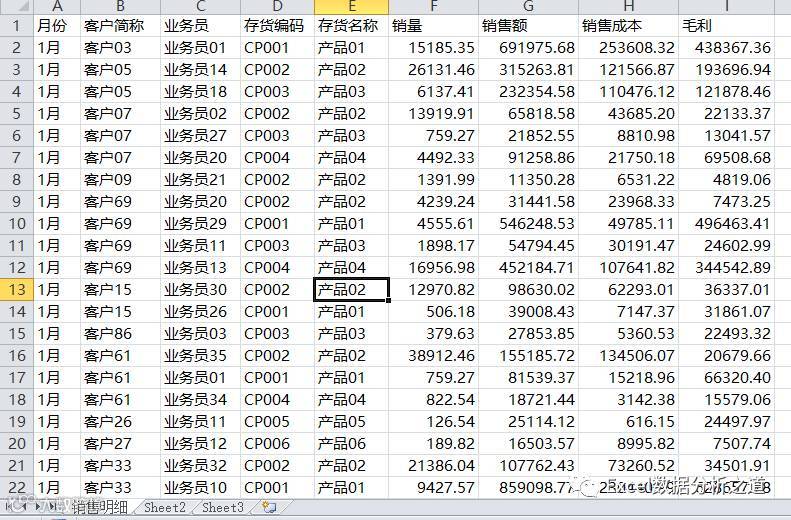 例子数据是从系统导出的去年年各个月份的销售明细数据,要求对客户的销售量、销售额、销售成本、毛利进行排名分析,比如查看销售量最大的前10位客户、销售额最大的前10位客户、毛利最大的前10位客户等等,并可以任意升序和降序排序。原始数据如下。