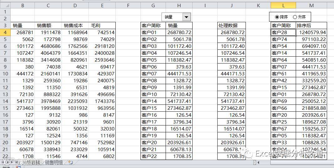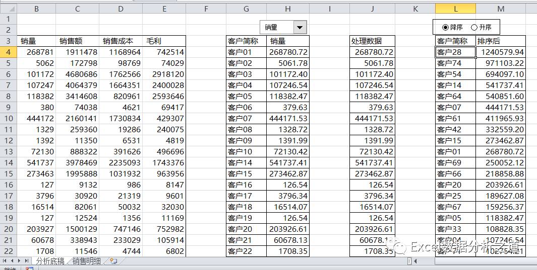 下面就是把J列数据进行降序和升序排序了。利用选项按钮来选择排序方式,使用LARGE函数和SMALL函数进行排序,就得到排序后的数据。然后利用MATCH函数和INDEX函数把排序后的数据对应的客户名称取出来,结果如下图的L列和M列所示: