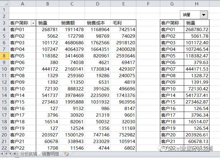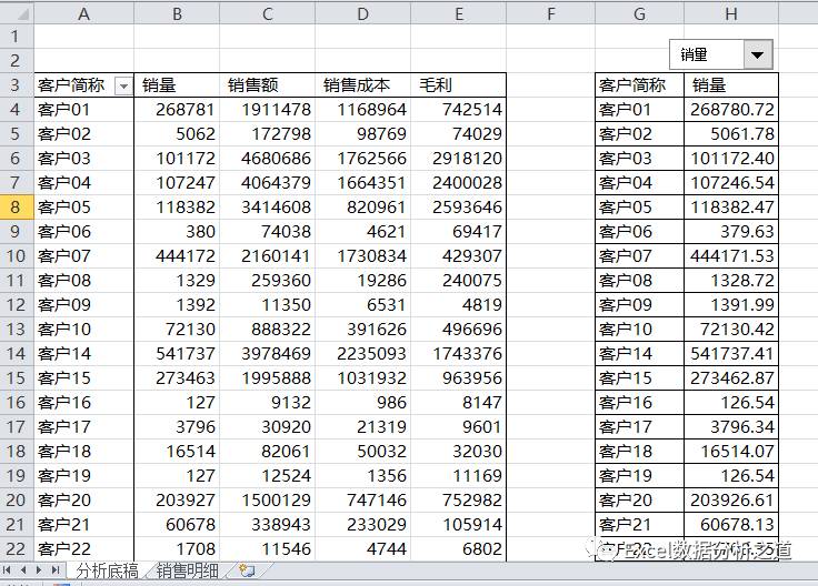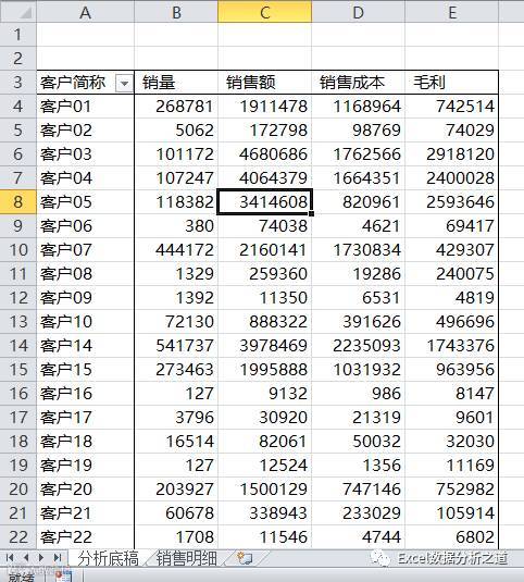 由于要分析每个客户的全年销售数据,所以第一步就是要把每个客户全年的数据进行汇总,这个工作使用数据透视表是最简单的,不到1分钟即可完成,结果如下: