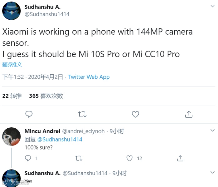 据爆料大神@Sudhanshu1414 透露,小米正在开发144MP的手机,可能是小米10s Pro,或者是小米CC10 Pro。