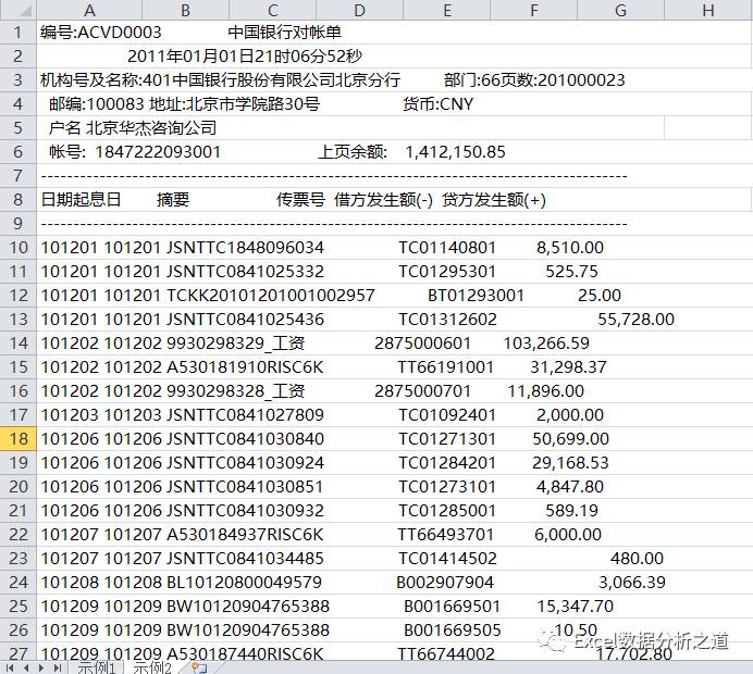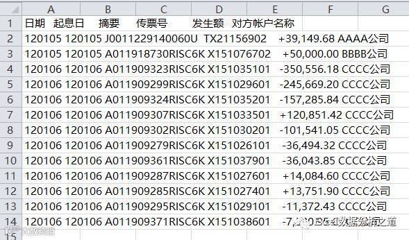 在进行银行对账前,首先需要把银行对账单的数据进行分列和整理。这种数据看起来很乱,但大部分情况下也有规律,整理起来也是不难的,其核心就是: