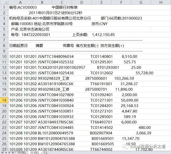 下面是关于银行对账单的两种数据格式,整理这样数据的核心技能就是分列工具。