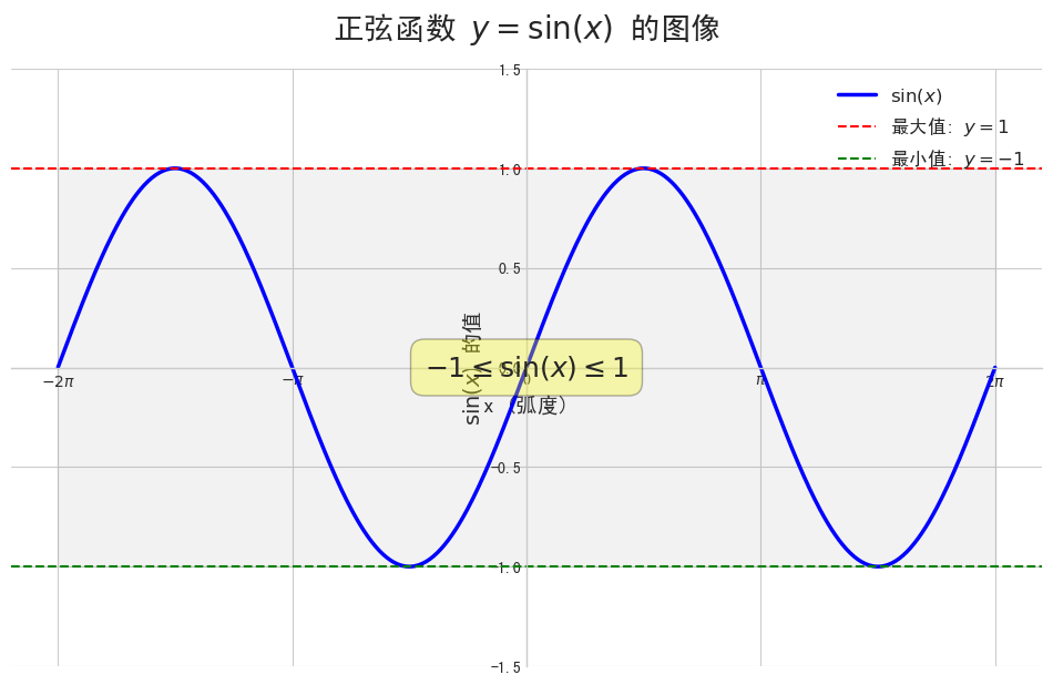 函数图像:如果我们画出正弦函数的图像,它是一条在 和 这两条水平线之间无限波动的曲线,其波峰为1,波谷为-1,也直观地证实了这一点。
