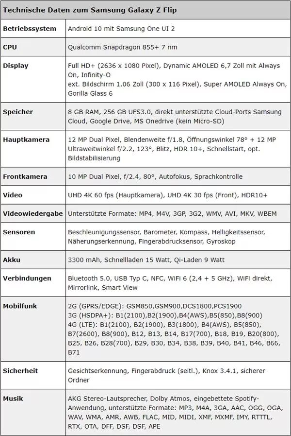 核心配置上,三星Galaxy Z Flip搭载高通骁龙855 Plus+UFS 3.0闪存,前置10MP(F/2.4 广角80°),后置双摄12MP主摄(F/1.8光圈)+12MP超广角,3300mAh,15W充电,9W左右的无线充电,不支持5G网络,不支持扩展。