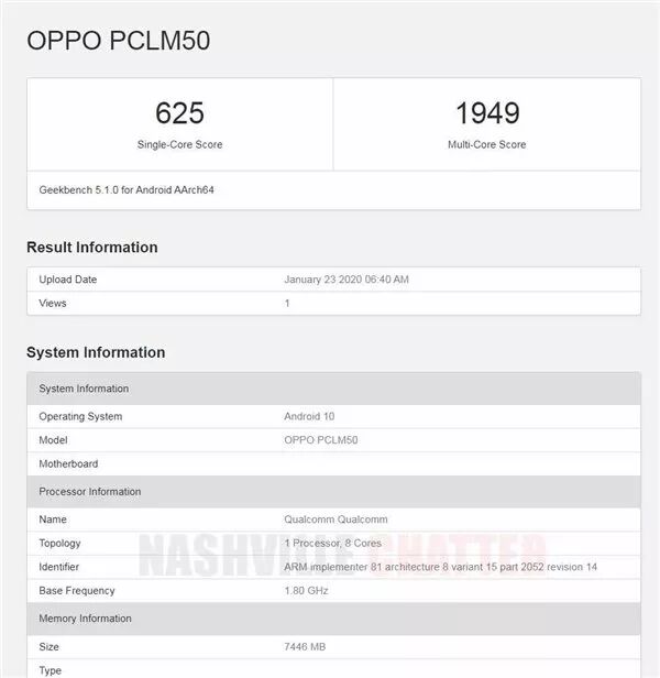 据了解,OPPO这款新机Geekbench 5.1.0版单核625分,多核1949分,搭载高通骁龙765G处理器,8GB RAM,Android 10。作为对比,OPPO Reno 3搭载的是联发科天玑1000L。