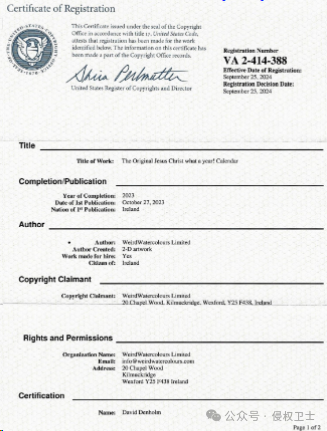2025年1月9日,权利持有人Weirdwatercolours Ltd.委托伊利诺伊州(IL)的维权律所Keith对自有版权Weirdwatercolours创意耶稣年历进行维权起诉,案件号2025-cv-00252。