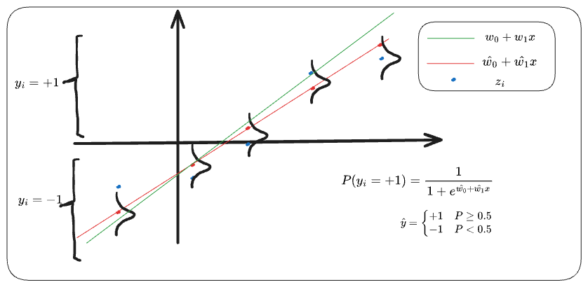 训练数据集的目标给出了 的符号,但我们不知道 的实际值和直线 的参数。当我们训练逻辑回归模型时,这样我们就可以顺理成章的估计 和 。经过训练后,我们可以使用这些估计值来预测任意数据点 的 =+1 的概率。最后,通过将该概率与阈值进行比较,可以预测出该点的目标值( )。