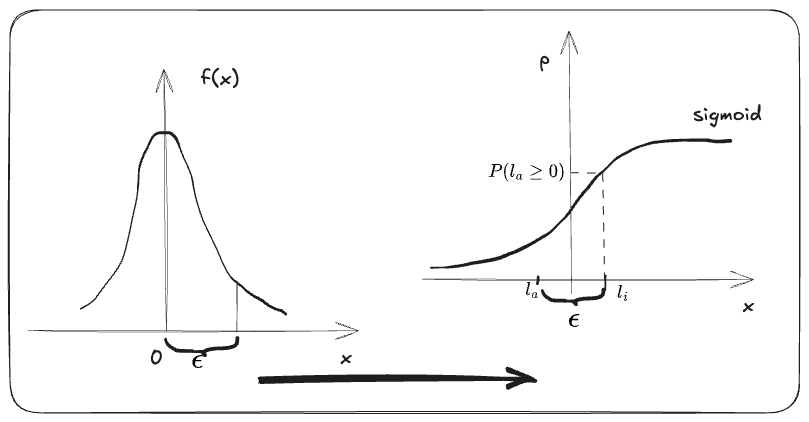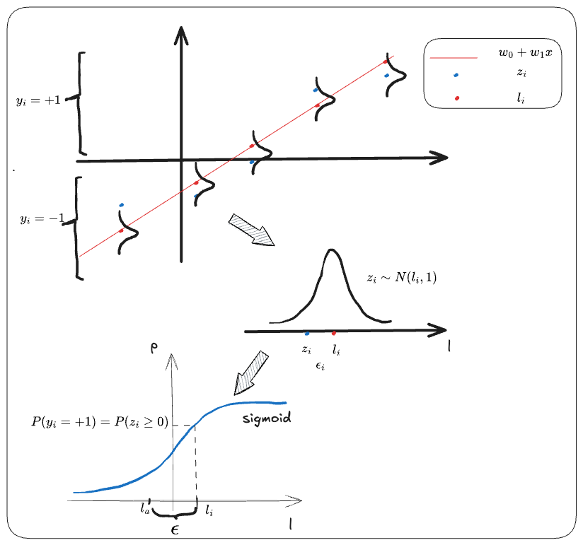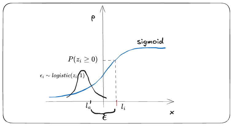 我们通过标准逻辑分布与sigmoid函数之间的关系,构建了 随机变量 与 0 的关系。