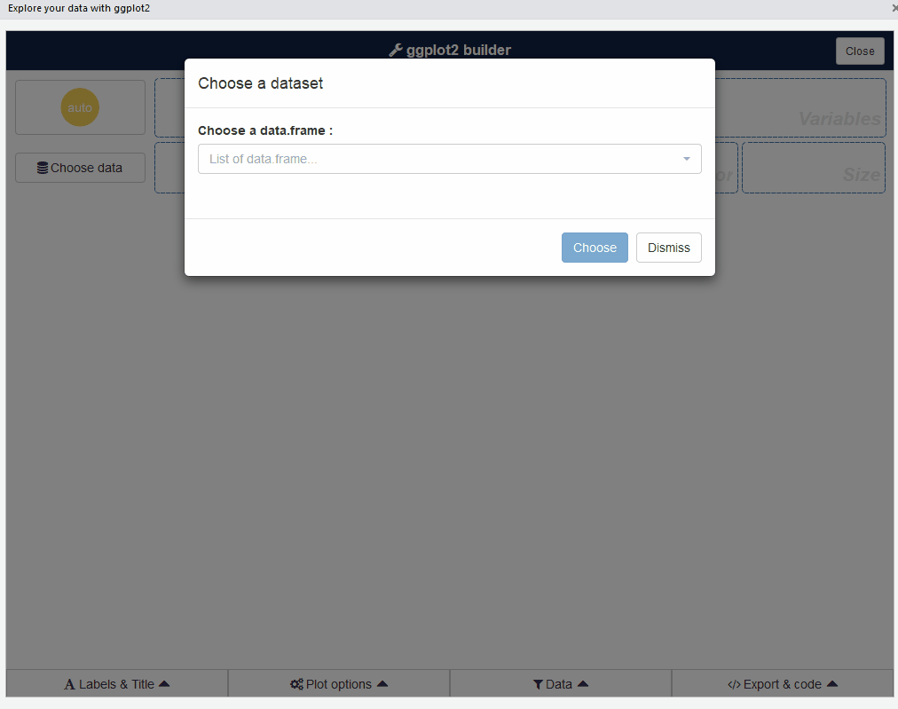 esquisse是一个快速创建ggplot2可视化的神奇工具。它提供了一个拖放界面,无需编写代码即可探索数据并生成图表。
