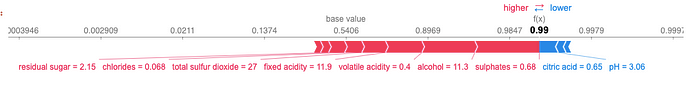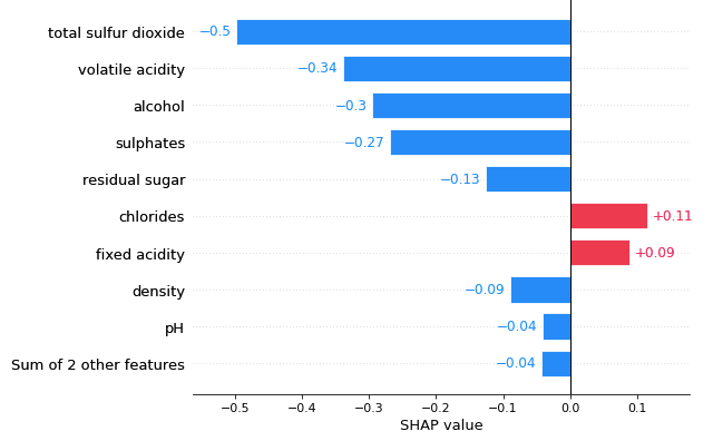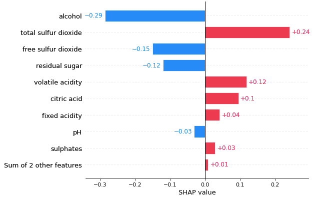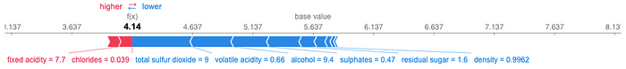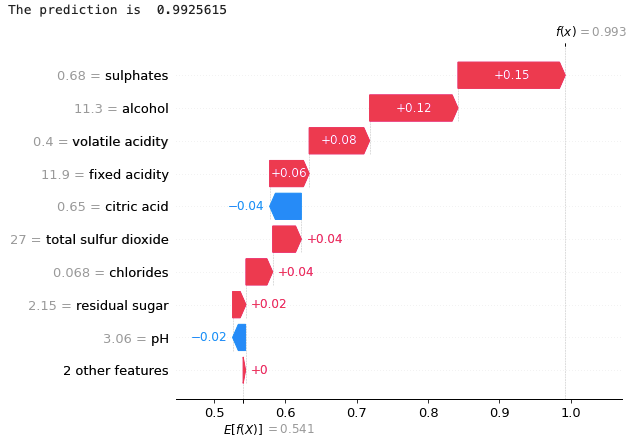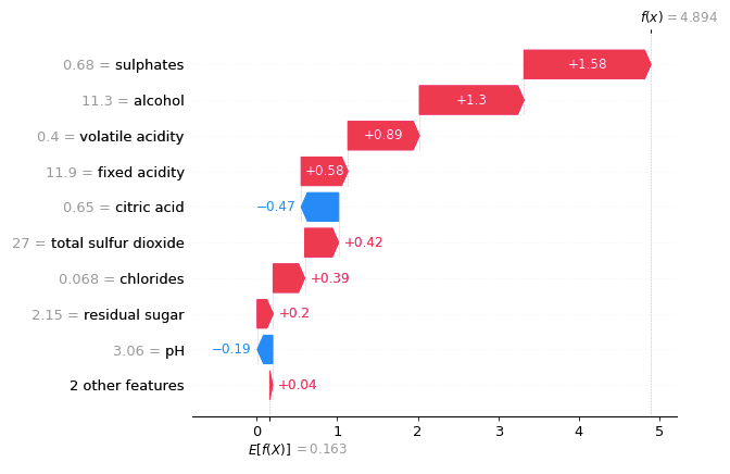 在瀑布图中,每个特征名称旁边都标注了该特征在该样本中的实际取值。例如,对于第一个观察样本,“酒精”含量的值是 9.4。那么,与所有其他葡萄酒相比,9.4 的酒精含量是高还是低呢?我们知道 SHAP 模型是基于训练数据集构建的,因此我们可以通过计算 X_train.mean() 来获取训练集中各特征的平均值。计算可得,所有葡萄酒的平均“酒精”含量约为 10.41。观察样本 1 的酒精含量 (9.4) 低于平均水平。鉴于较高的“酒精”含量通常对品质评分有积极贡献,而该样本的酒精含量偏低,因此“酒精”这一特征对该酒的品质预测产生了 -0.3 的负向SHAP贡献,正如在图 (2.1.1) 中所清晰展示的那样。