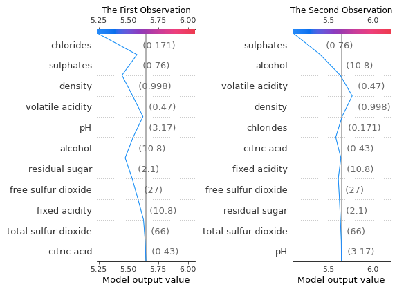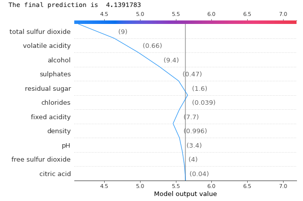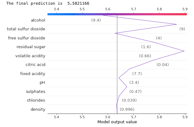 当模型中涉及的预测变量数量非常多时,力图可能会因为信息过于密集而显得有些杂乱,不易解读。在这种情况下,决策图便成了一个更优的选择。图 (2.4.1) 展示了观察样本 1 的决策图。它清晰地表明,模型对该样本的最终预测评分为 4.139 (约等于 4.14)。图中央的垂直虚线代表了模型的基准预测值。每一条从底部基准值出发向上延伸的折线,代表了一个特征对预测路径的影响。括号中的数字是该特征在当前样本中的实际值。例如,观察样本 1 的“酒精”含量为 9.4。我们已经知道,较高的酒精含量通常会正向提升葡萄酒的品质。那么,9.4 的酒精含量算好吗?正如我们在 (2.1.1) 节中讨论过的,通过 X_train.mean() 我们可以得到训练集中所有葡萄酒的平均“酒精”含量约为 10.41。由于观察样本 1 的酒精含量 (9.4) 低于平均水平,因此“酒精”这个特征对该酒的品质预测贡献为负,导致预测路径向左偏折,如图 (2.4.1) 所示。决策图以这种逐级决策路径的方式,清晰地展现了各个特征如何共同作用,将预测从基准值一步步引导至最终的输出值。