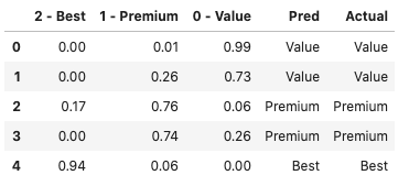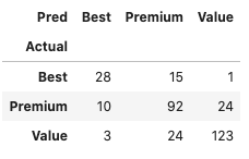 multiclass_actual_pred.columns = ['2 - Best','1 - Premium','0 - Value','Pred','Actual']