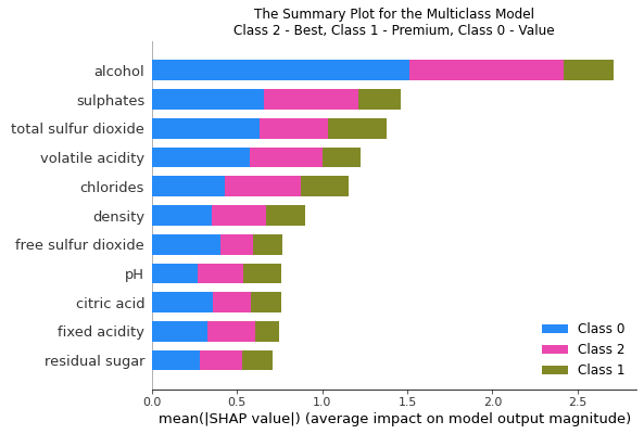 plt.title('The Summary Plot for the Multiclass Model'+'\n'+'Class 2 - Best, Class 1 - Premium, Class 0 - Value')