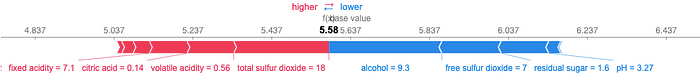 关于力图的详细解读,我在之前的文章《SHAP教程-01 |解密“黑箱”模型的底层逻辑》中已有深入阐述。简而言之,力图将模型的预测过程比作一场“博弈”。对于观察样本 1,我们的 XGBoost 模型给出的预测评分为 4.14。力图生动地展示了这个预测是如何形成的:它从一个代表模型平均预测的基准值 (5.647) 出发,图中红色的特征(如柠檬酸、pH值)如同“加速器”,将预测值向右(高分方向)推动;而蓝色的特征(如酒精含量、挥发性酸度、总二氧化硫)则扮演“减速器”的角色,将预测值向左(低分方向)拉拽。正是这些正负力量的相互作用与平衡,最终将预测稳定在了 4.14。