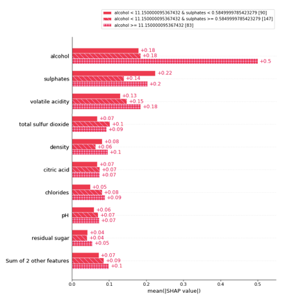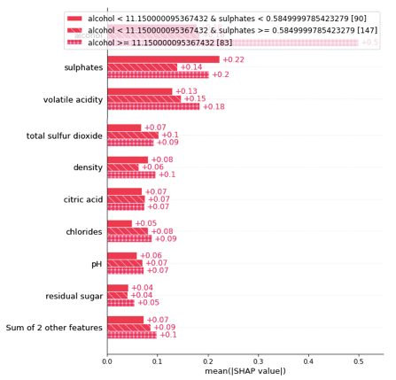 图 (1.2): SHAP 队列图 (实红色为酒精含量<11.15的队列,白格红为酒精含量>=11.15的队列。每个队列内部展示了各自的特征重要性条形图,突显了不同群体中特征影响的差异