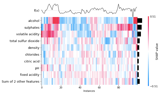 接下来,让我们随机选取 100 个红酒样本,并利用 SHAP 生成信息量极为丰富的热力图。如图 (1.3) 所示,这张图表蕴含了多重解读维度。