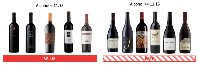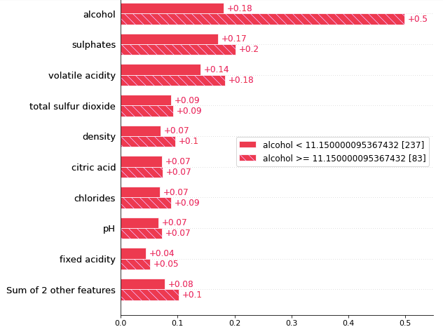在很多实际场景中,将总体数据根据某一关键特征划分为不同的队列进行分析,往往能带来更深刻的洞察,揭示群体间的异质性。图 (1.2) 便是一个生动的例子:它将我们的红酒样本根据酒精含量分成了两个队列:酒精含量低于 11.15 的样本,以及酒精含量高于或等于 11.15 的样本。结合图 (1.1) 我们已知“酒精”是影响红酒品质最重要的特征,而图 (1.2) 则进一步告诉我们,“酒精”这个特征在第二个队列(高酒精含量组)中的重要性甚至更为突出。