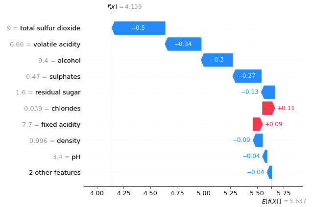 下图展示了对测试集 (X_test) 中第一个观察样本的预测分析。整个“推导”过程始于底部的基准值 5.637,这个值代表了模型对所有训练样本的平均预测。而模型对观察样本 1 的最终预测值是 4.139,显示在图的顶端。那么,这个 4.139 是如何得到的呢?瀑布图清晰地揭示了这一过程:5.637 (基准值) – 0.04 (某特征的负贡献) – 0.04 (另一特征的负贡献) – 0.09 + 0.09 + 0.11 – 0.13 – 0.27 – 0.3 (总二氧化硫的负贡献) – 0.34 (挥发性酸度的负贡献) – 0.5 (酒精含量的负贡献) ≈ 4.139 请注意,由于浮点数运算,可能存在微小的舍入误差。