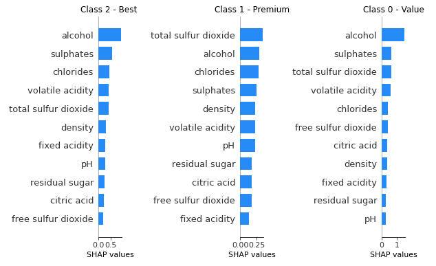 当您的机器学习任务涉及到将样本划分到三个或更多个互斥类别时,您构建的便是多分类模型。SHAP 值同样能够为这类模型提供深刻的解释。在本节中,我将演示如何操作。首先,我们基于原始的品质评分创建一个新的多分类目标变量 ‘Multiclass’,它包含三个类别:‘Best’ (最优)、‘Premium’ (优质) 和 ‘Value’ (物超所值)。然后,我们通过在 XGBoost 的 XGBClassifier 中将 objective 参数设置为 multi:softprob (或者 multi:softmax 如果类别数量也作为参数) 来训练一个多分类模型。
